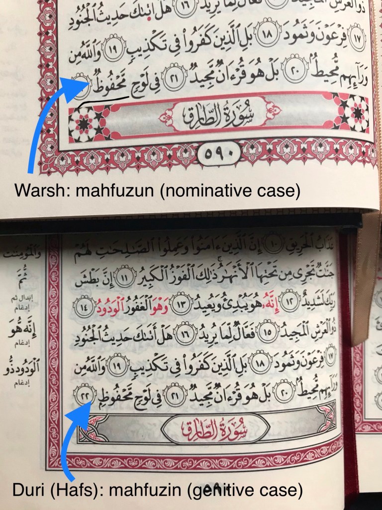 The reason I ask the question is because there is a grammatical difference in the word guarded depending on whether you are reciting a Hafs Qur’an or a Warsh Qur’an. Below is a picture of the relevant text in both Riwayat, and you will see that the Warsh on top ends with a dammah (indicating the adjective is in the nominative case), while the lower text ends with a kasrah below the last letter (indicating the word is in the genitive case).
